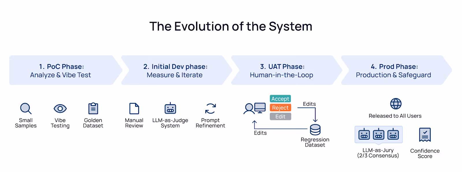 - UAT Phase: We introduced a "Human-in-the-Loop" step. Select claim adjusters were given the ability to accept, reject, or edit the AI's output. Every single edit became a precious data point. We used this data to improve the LLM-as-Judge and build a regression dataset.
