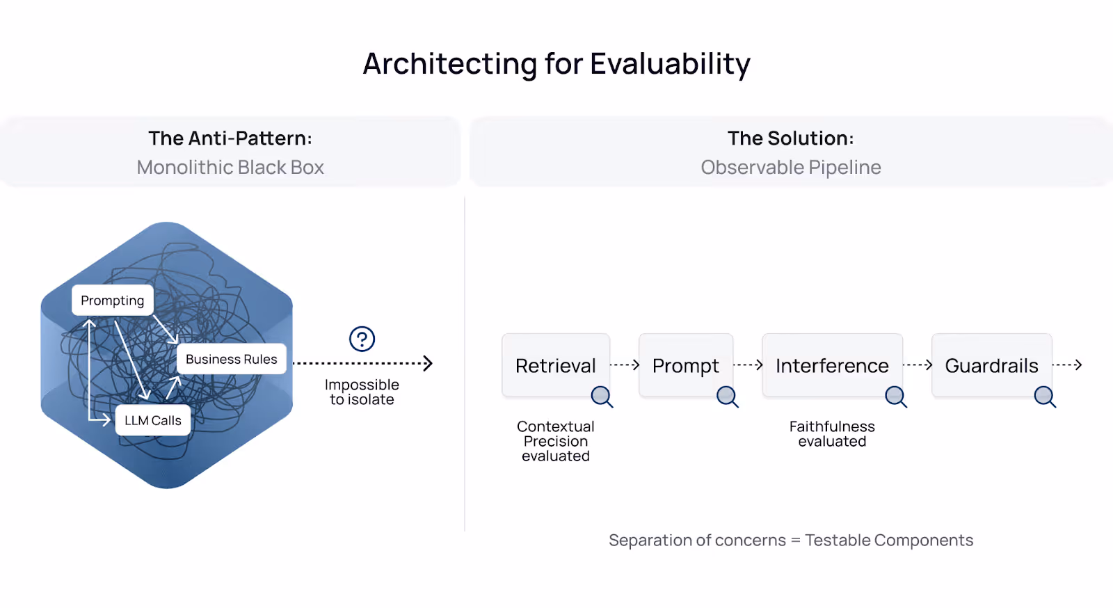 - The Anti-Pattern: Monolithic Black Box. In our early builds, everything was tightly coupled. Prompting, business rules, and LLM calls were all mixed together in a single unit. This made isolation impossible. If an output was wrong, was it a bad prompt? Bad context retrieval? Or the model itself?