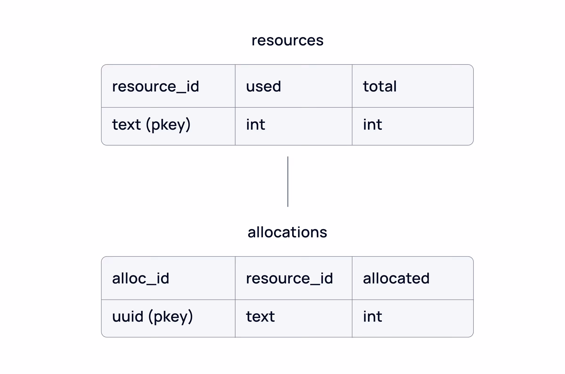 To avoid diving into the complexities of our actual data tables, we would like to present the table structures in a simplified format. Consider the two tables shown below. The first table records resources and tracks their usage & total capacity. Any resource allocations must be registered with the second table in a transaction so that both tables are consistent.