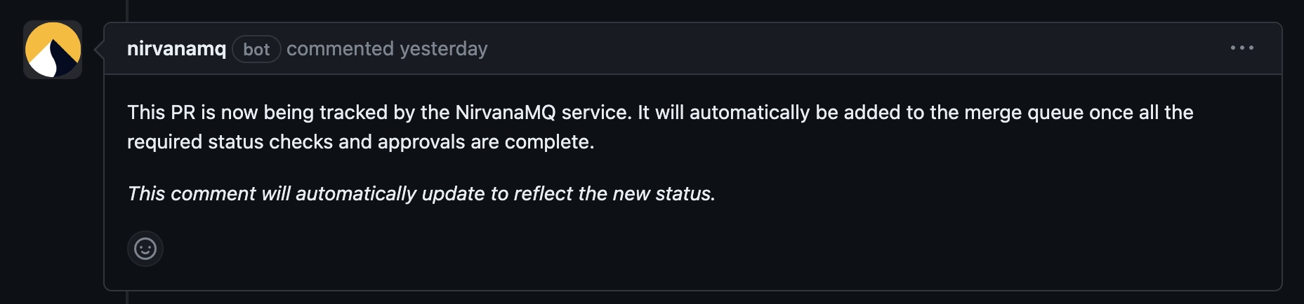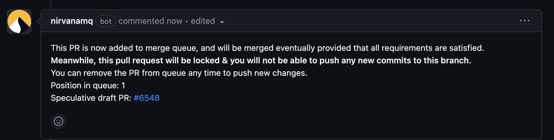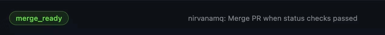 Our repo requires: CI passing, at least one approval, and all comments resolved. Once a PR is labeled with merge_ready, NirvanaMQ listens for relevant GitHub Webhooks:
