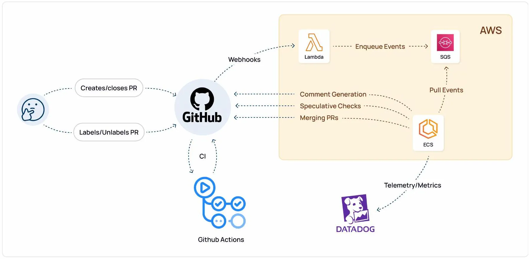 - Key features over GitHub’s native MQ: skip-ahead for urgent PRs, unlimited queue size, granular notifications, timeline view, and dedicated observability via Datadog, all at negligible infra cost.
